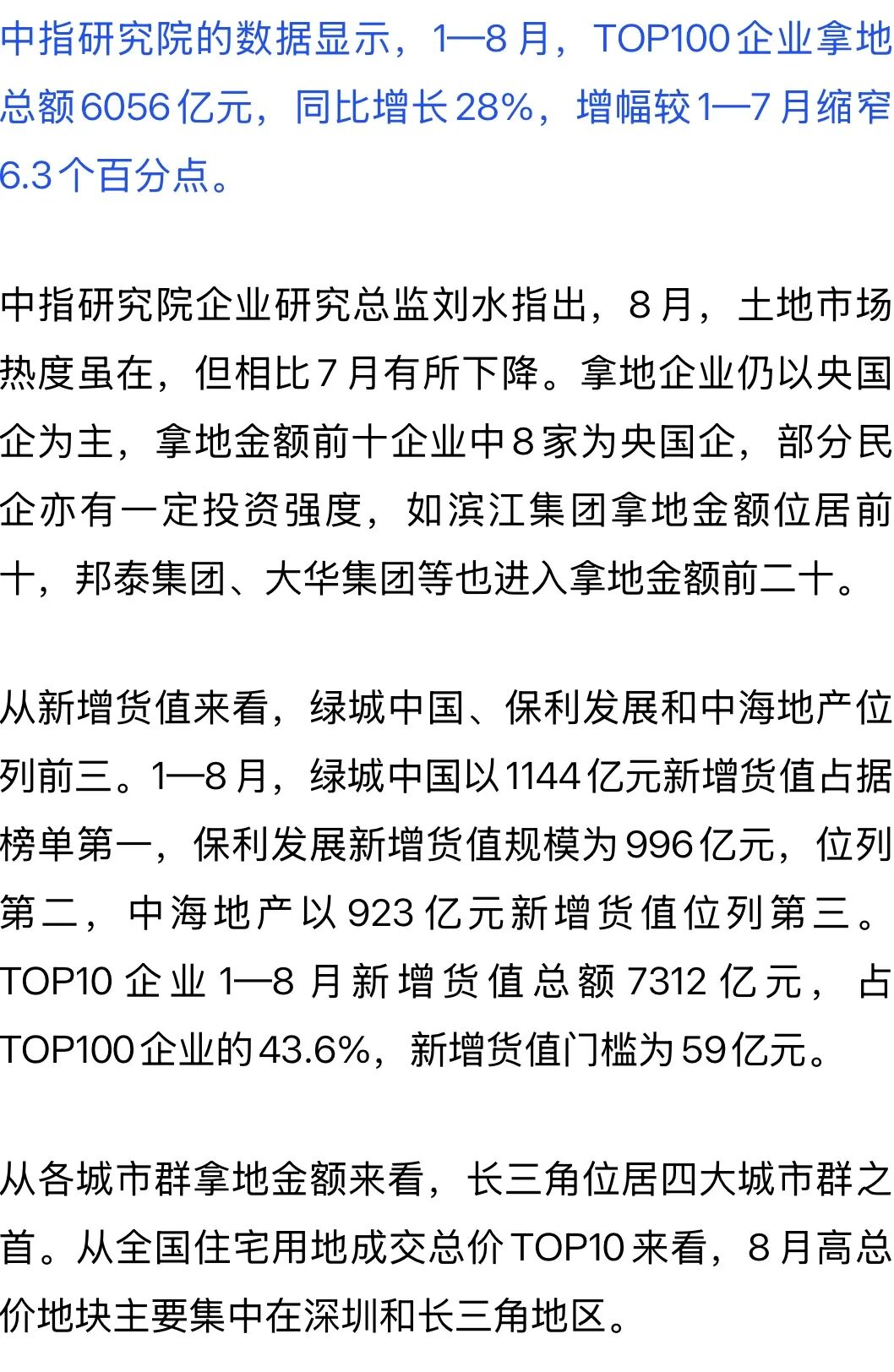 数据显示,1—8月,TOP100企业拿地总额6056亿元,同比增长28%。从新增货值来看,绿城中国、保利发展和中海地产位列前三。从各城市群拿地金额来看,长三角位居四大城市群之首。