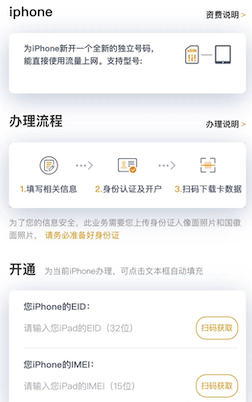 从界面信息中不难发现,用户需要输入自身机型的EID和IMEI号码来进行开通办理,相较于境外该业务可直接通过邮件扫码获取号码的步骤来说还略显繁琐。另外,页面还显示目前该业务的设定为“新开一个全新的独立号码”,暂时无法看出未来老用户将如何实现旧有号码迁移至eSIM。