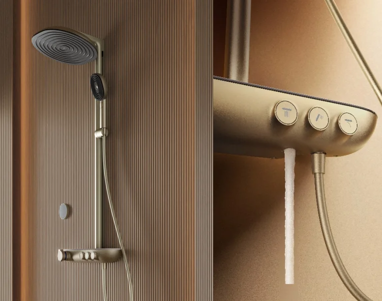NOVIA诺亚明装恒温淋浴器则推出轻智能款、两功能款与三功能款三种配置。其中,轻智能款支持冷水预排,实现丝滑恒温出水;同时配备可视化水温调节,通过智能芯片精准控制,杜绝传统试温困扰。创新隐藏式下出水设计兼顾实用与安全,有效规避空间占用与磕碰风险,满足日常快速取水、冲洗等需求。