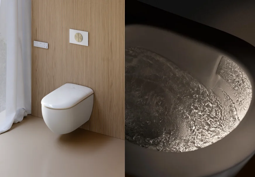 NOVIA诺亚壁挂式智能坐便器则采用AXENT恩仕的专利技术AXENT. INFINITY无极漩吸系统,通过流体力学建模分析,在陶瓷洗净面上构建特殊形状,促进强力漩涡的形成。同时,这一冲刷技术大幅减轻了对水封的冲击,较传统冲落式噪音降低55%,提供静谧舒适的卫浴体验。