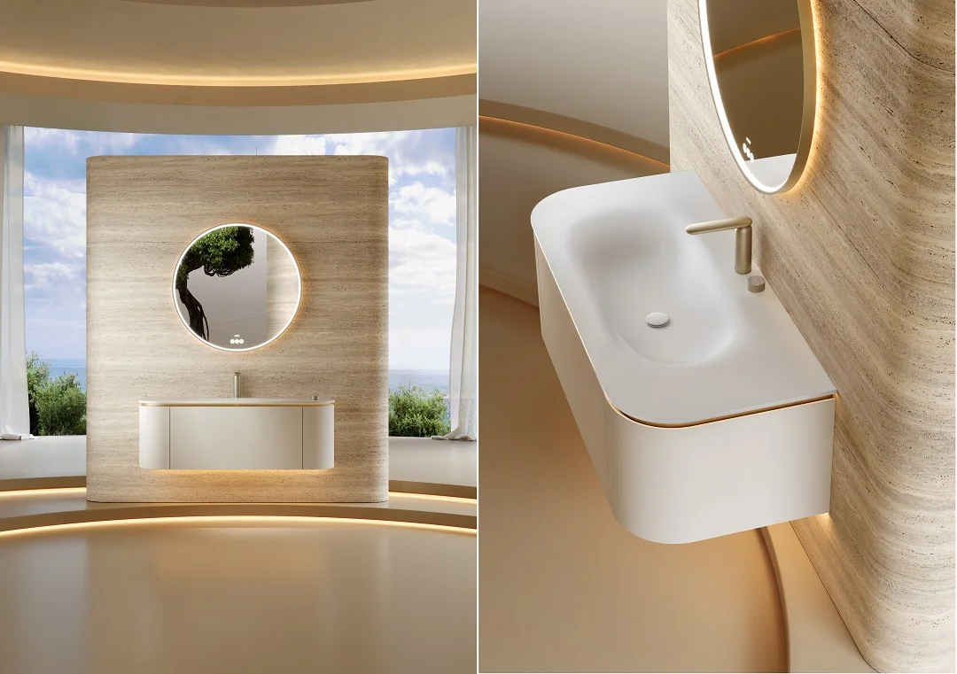 另一款浴室柜则以单盆设计为核心,杏子灰饰面与圆弧边角设计碰撞出几何韵律。台面下及柜底延续人体感应灯设计,智能镜面触控响应便捷精准,尽显智慧交互的魅力。