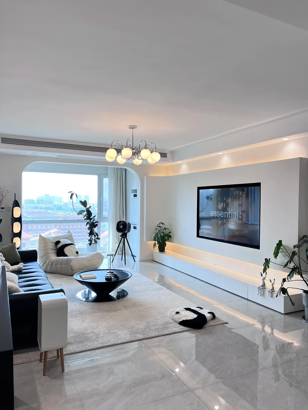白色的悬浮电视柜,搭配暗藏灯带,科技感满满。电视背景墙干净简洁,几盆绿植点缀其间,为空间增添生机。客厅的吊灯造型独特,柔和的灯光洒下,氛围感拉满。