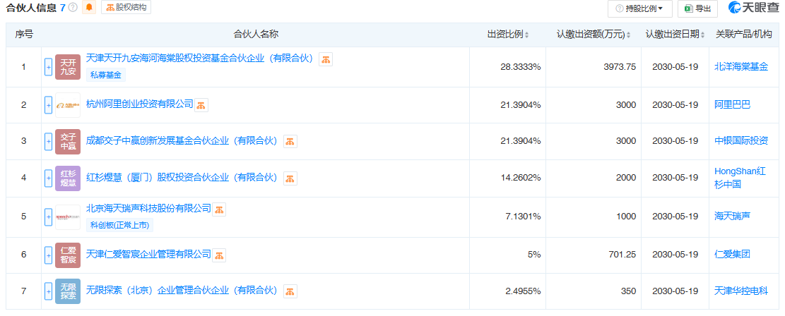 更受市场关注的是其“豪华”的出资阵容,包括了天津天开九安海河海棠股权投资基金合伙企业(下称“天开九安”)、杭州阿里创业投资有限公司(下称“阿里创投”)、红杉煜慧(厦门)股权投资合伙企业(有限合伙)、北京海天瑞声科技股份有限公司(下称“海天瑞声”)等7家国资基金、产业资本、企业。