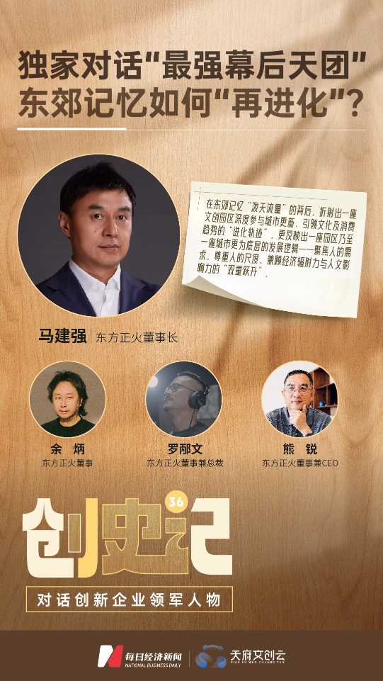 近日,每日经济新闻・天府文创云记者特地邀请到东郊记忆整体运营公司――东方正火的创始团队,在其接棒东郊记忆四周年之际,分享他们眼中这座“顶流”园区,如何从流量跨越到留量,实现再进化。同时,从这群“想象力的操盘手”身上,一窥这座城市的产业潮流与风向。