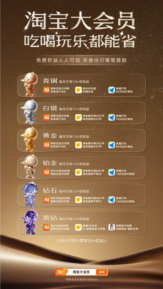 据了解,淘宝大会员体系覆盖所有用户,共分为6个等级:青铜、白银、黄金、铂金、钻石和黑钻。铂金及以上会员可以88元开通88VIP。