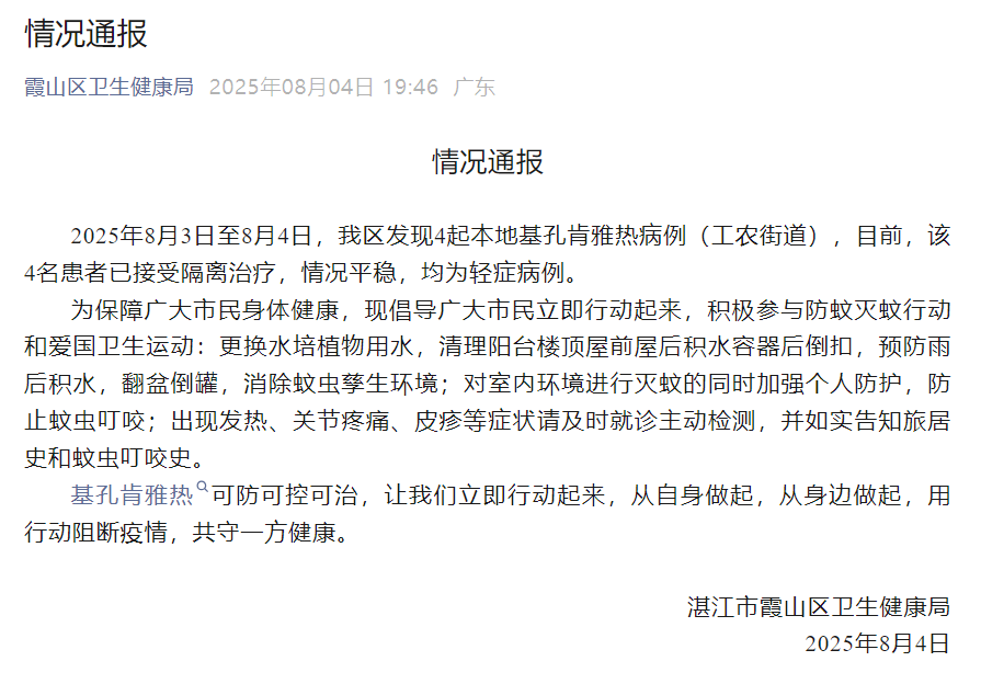 为保障广大市民身体健康,现倡导广大市民立即行动起来,积极参与防蚊灭蚊行动和爱国卫生运动:更换水培植物用水,清理阳台楼顶屋前屋后积水容器后倒扣,预防雨后积水,翻盆倒罐,消除蚊虫孳生环境;对室内环境进行灭蚊的同时加强个人防护,防止蚊虫叮咬;出现发热、关节疼痛、皮疹等症状请及时就诊主动检测,并如实告知旅居史和蚊虫叮咬史。