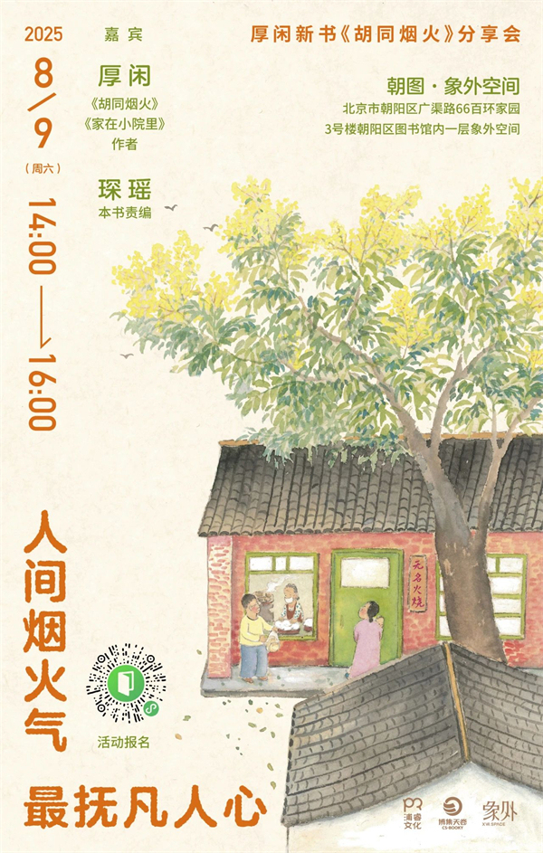 小红书人气绘画博主、畅销书《家在小院里》作者厚闲将带着她全新治愈系图文集《胡同烟火》做客朝图·象外空间。8月9日,她将与本书责编琛瑶一起细数岁月时光里的美好生活。