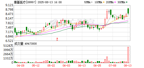 8月13日,康基医疗停牌近一个月后复牌,高开逾5%,股价一度冲至今年最高值8.89港元/股,截至收盘,股价为8.5港元/股,总市值102.68亿港元。消息面上,继7月18日发布停牌公告后,8月12日晚间,康基医疗终于披露停牌原因,公司拟私有化退市,这一消息引发市场关注。