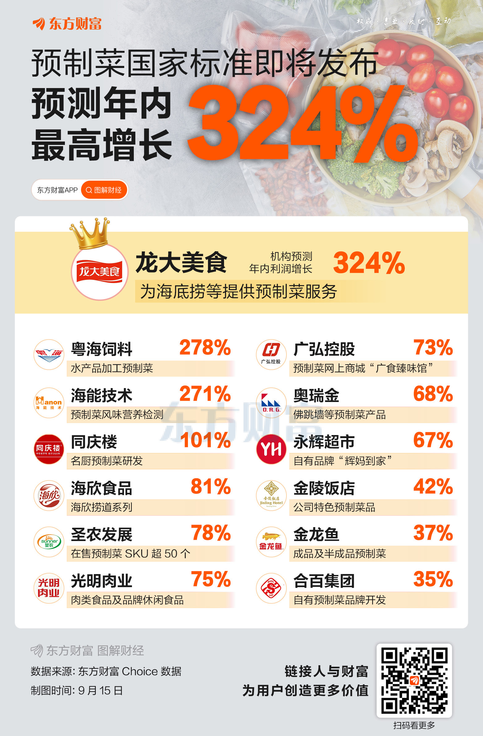 近日,有关西贝的话题频上热搜,预制菜成为讨论焦点。据财联社报道,国家卫健委主导的《预制菜食品安全国家标准》草案已通过专家审查,即将向社会公开征求意见。受此影响,今日预制菜概念板块有所异动,得利斯一字涨停,天康生物、龙大美食、惠发食品等多股跟涨。