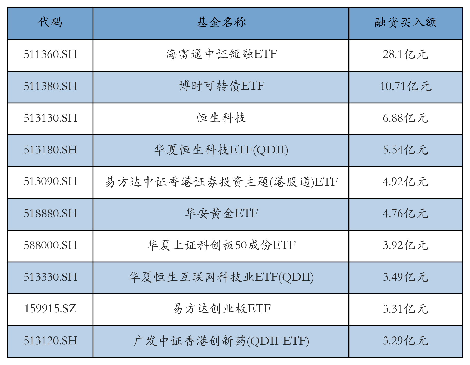 3月12日ETF融资买入额前三位分别为:海富通中证短融ETF(28.1亿元)、博时可转债ETF(10.71亿元)和恒生科技(6.88亿元),前10具体见下表: