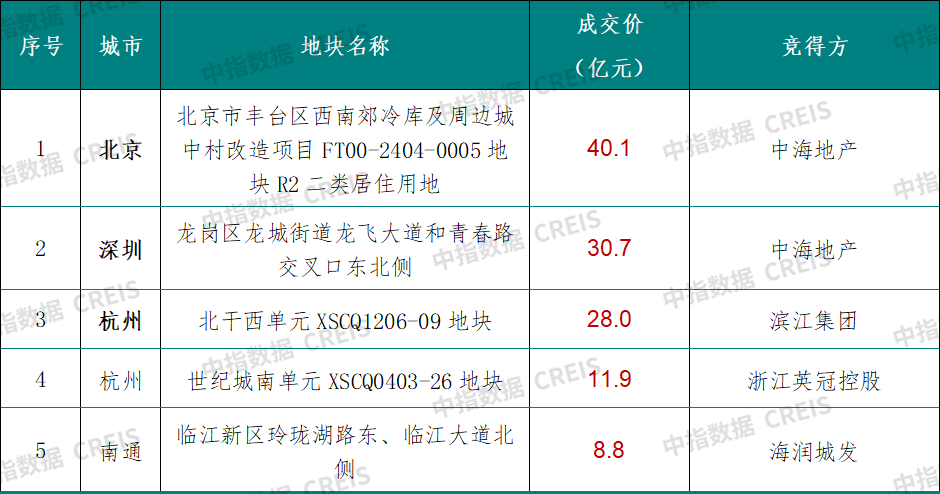 ▍宅地总价TOP5:北京地块宅地成交价居首位,TOP5中一线城市占二席
