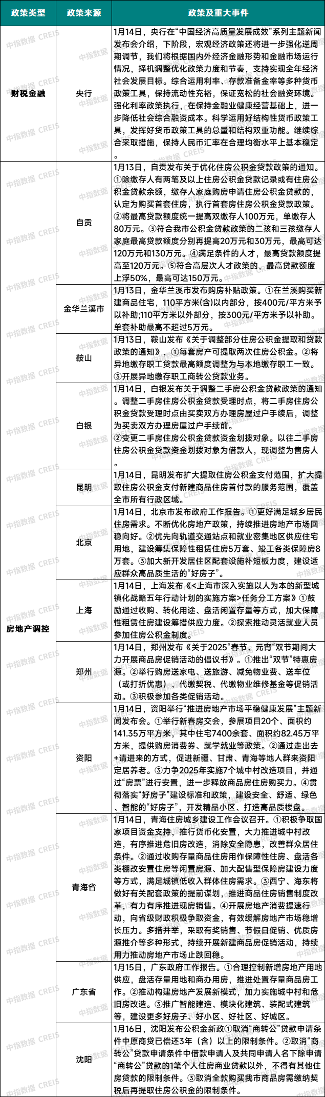 3、政策动态:央行发布会中表示择机调整优化政策力度和节奏,支持实现全年经济社会发展目标。昆明、沈阳、自贡等地从提高公积金贷款最高额度、延长还款时间、支持公积金支付首付等方面满足购房者合理住房需求。金华兰溪市等地发放购房补贴。郑州、资阳等地举行新春房交会。北京、广东、青海等地布置2025年房地产市场重点工作。