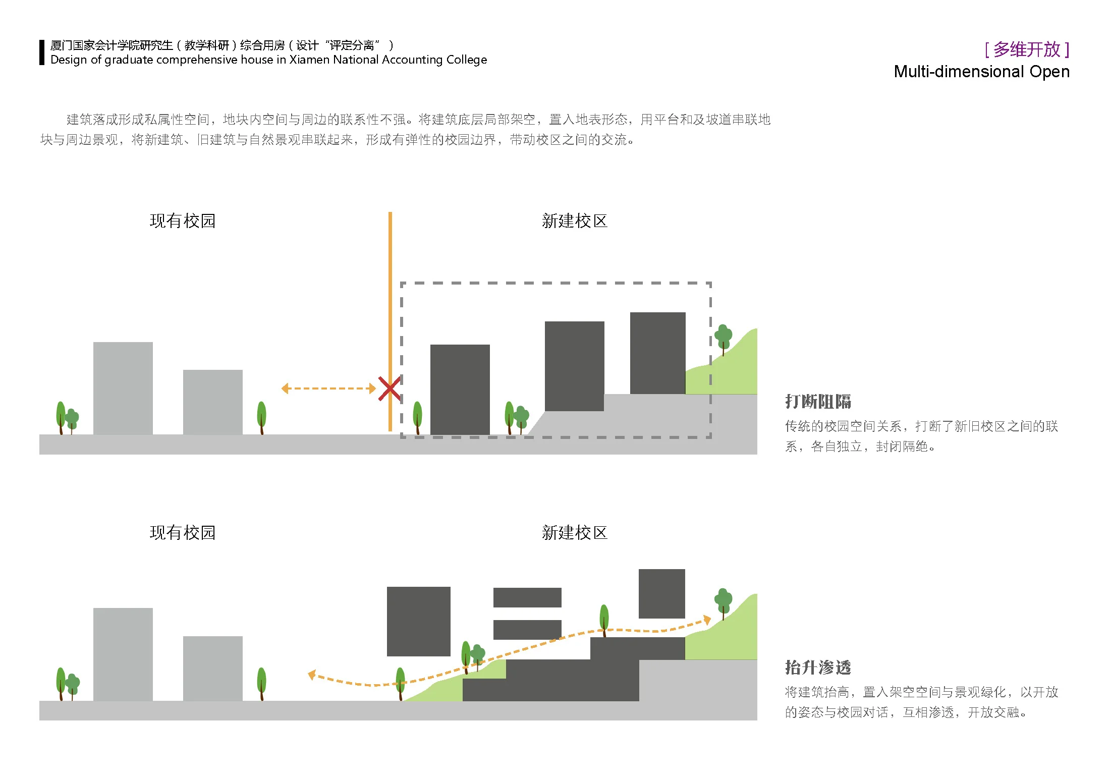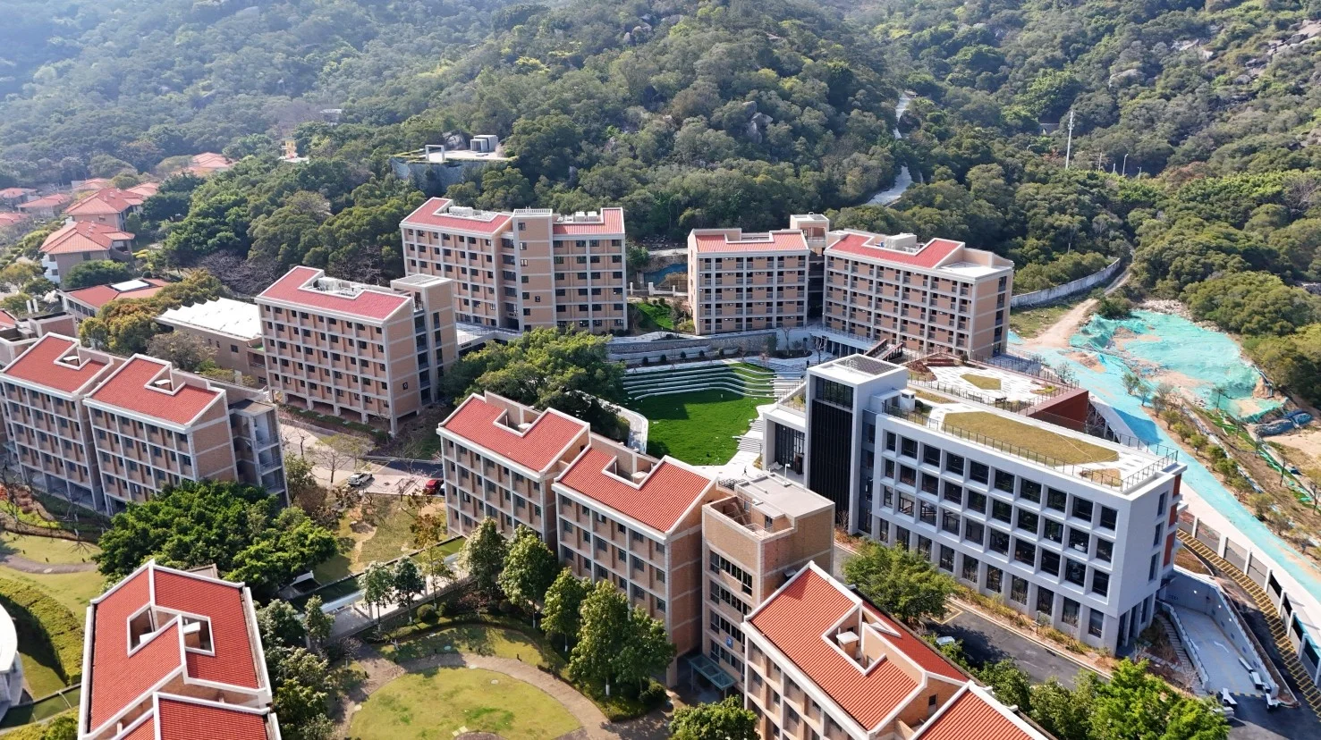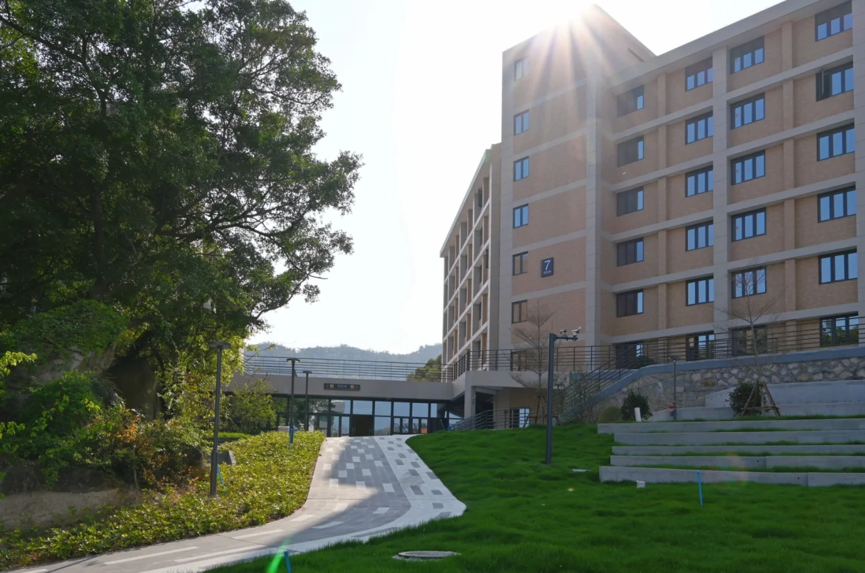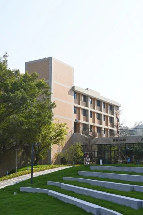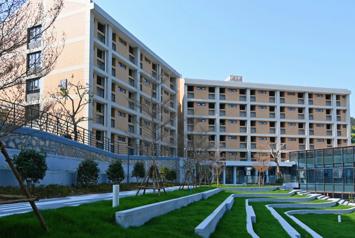 在建筑风格上,新楼群延续校区原有肌理,采用分散式布局,与既有宿舍区和谐相融。立面设计巧妙提取闽南传统建筑元素,以砖红色为主色调,搭配白色线条与灰色基座,既呼应校园历史风貌,又通过简洁灵动的网格肌理展现现代学院气质。功能布局兼顾实用性与人性化;综合楼内教学、办公、生活服务三大功能高效分区,6.6米标准柱网灵活适配多样化场景,满足普通教室、实验室、会议室等需求。