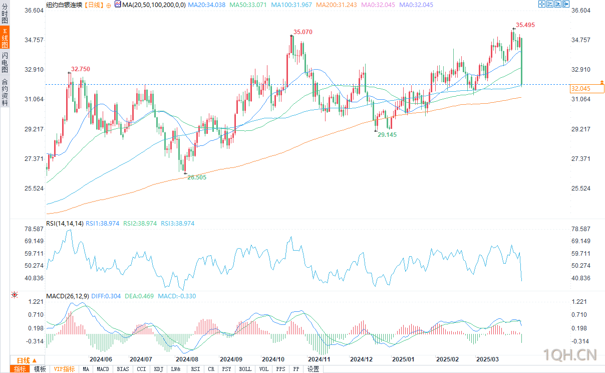 北京时间00:39,现货金报3107.91美元/盎司,跌幅0.77%。COMEX期金报3129.7美元/盎司,跌幅1.15%。现货银报31.921美元/盎司,跌幅5.67%。COMEX期银报32.015美元/盎司,跌幅7.60%。