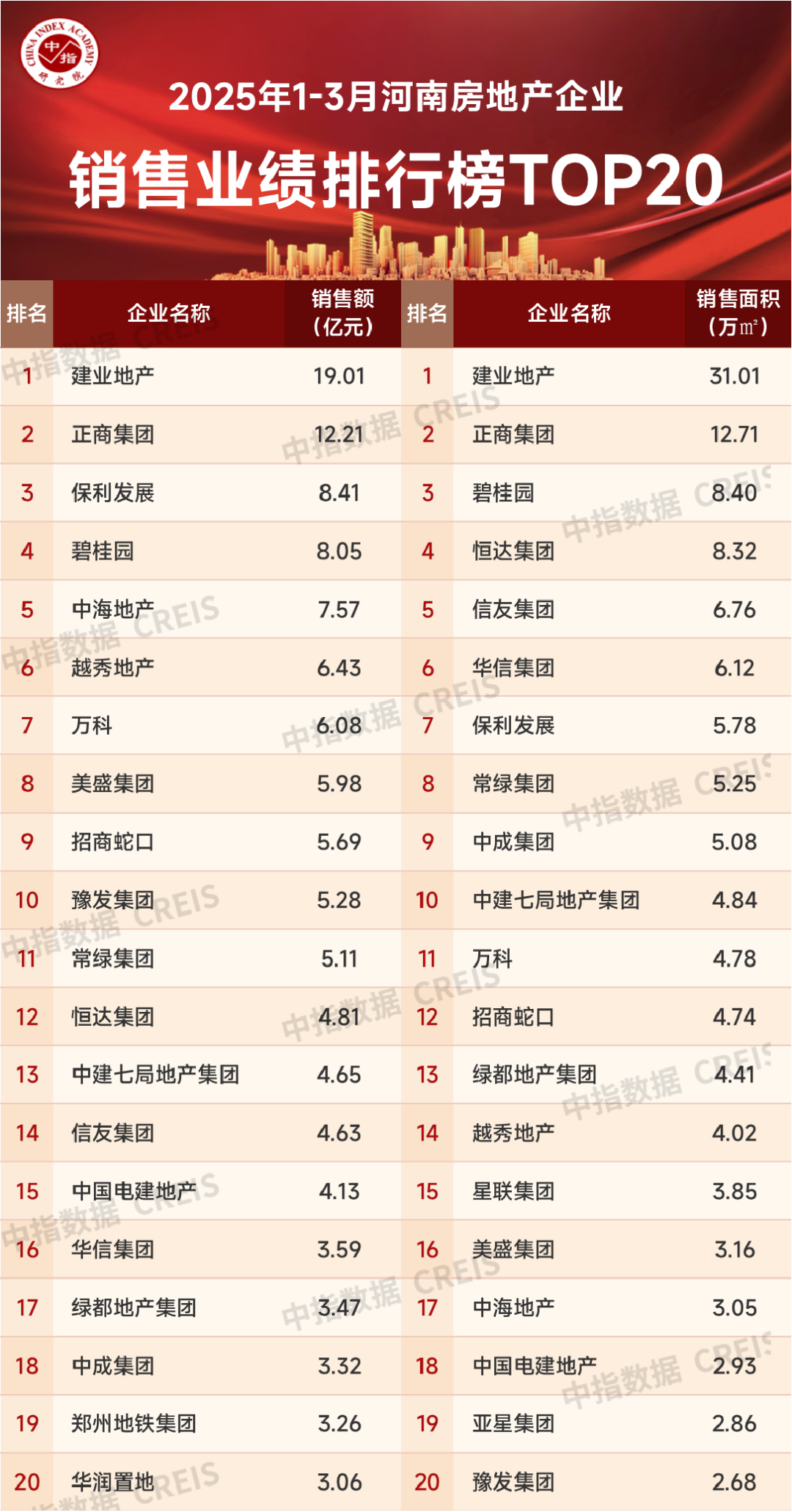 2025年1-3月河南省房地产企业销售业绩TOP20