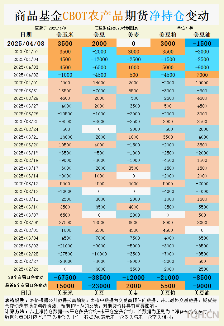 持仓方面,4月8日基金净买入3500手多头,近5个交易日净多15000手,逆转30个交易日净空67500手的趋势,显示交易员对反弹信心增强。技术面上,玉米在4.65美元/蒲式耳企稳,短期动能偏强。
