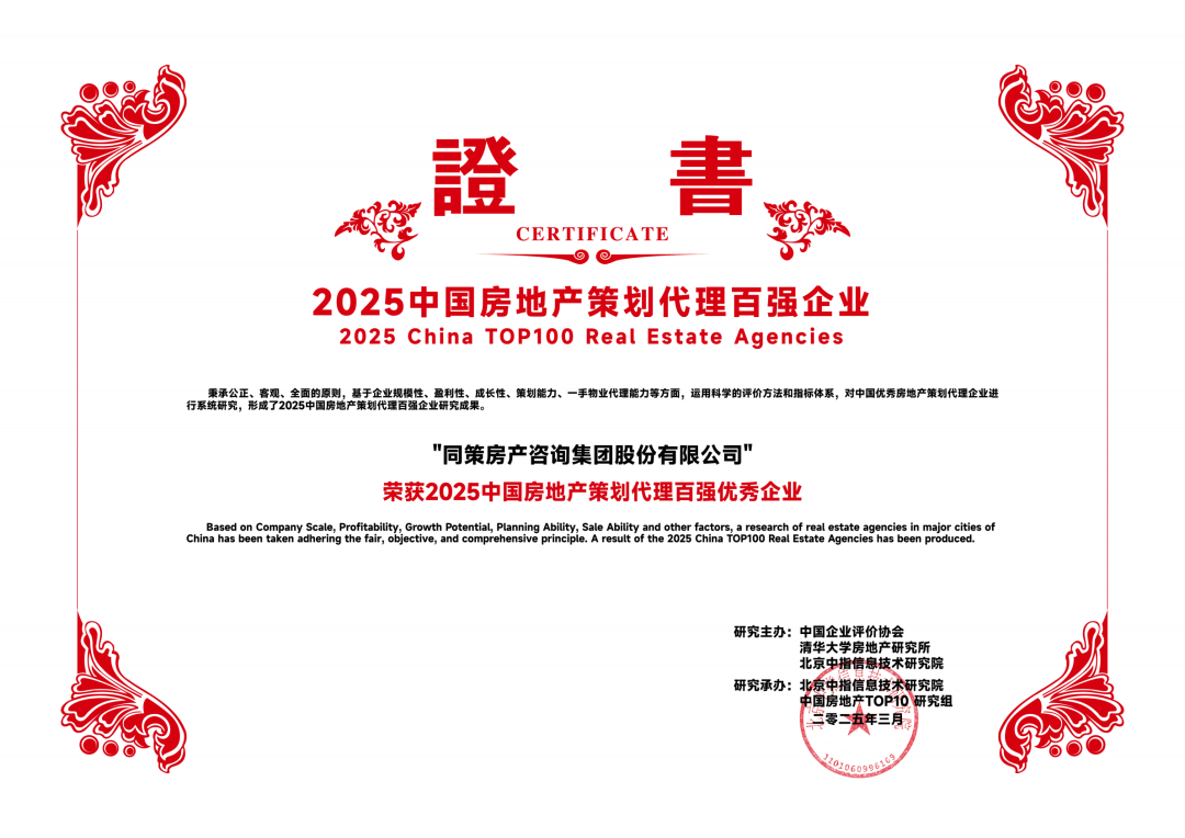 在风云变幻的房地产市场中,同策集团(以下简称“同策”)凭借敏锐的行业洞察力与卓越的专业服务,荣获“2025中国房地产策划代理百强优秀企业”。