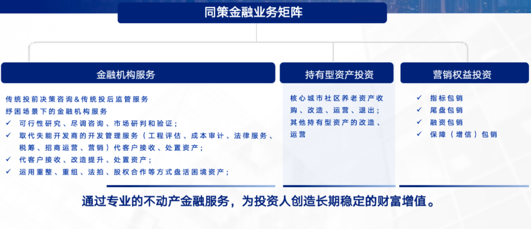 资管运营:面向产业园区、写字楼、公寓、养老、商业、酒店等核心赛道,提供覆盖资产评估、定位改造、品牌招商、全周期运营、资产证券化退出的一站式资管解决方案。
