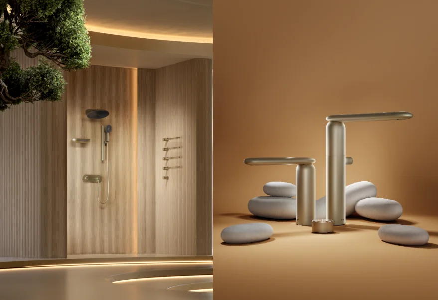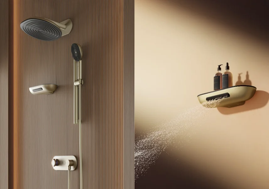 NOVIA诺亚五金承袭该系列的设计理念,涵盖淋浴器、龙头及挂件三大品类,提供流沙金、经典镀铬、陨石灰三款配色选择,精准适配多元空间美学需求。