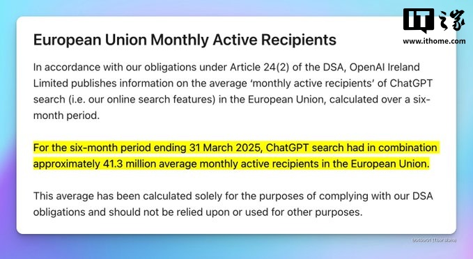 据IT之家了解,OpenAI 定期公布 ChatGPT Search 的相关数据,这是为了遵守欧盟的《数字服务法》(Digital Services Act,简称 DSA)。DSA 对欧洲国家的在线服务进行了多方面的规范,其中对“月活跃用户”的定义为:在特定时间段内,至少通过在线平台的界面接触过一次信息(如查看或收听)或提供过信息的用户。