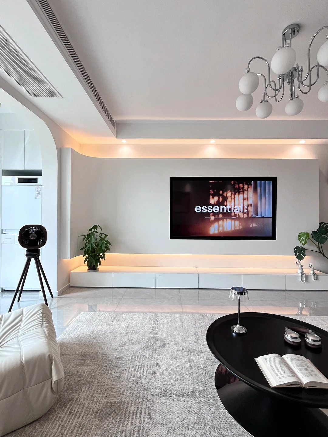 白色的悬浮电视柜,搭配暗藏灯带,科技感满满。电视背景墙干净简洁,几盆绿植点缀其间,为空间增添生机。客厅的吊灯造型独特,柔和的灯光洒下,氛围感拉满。