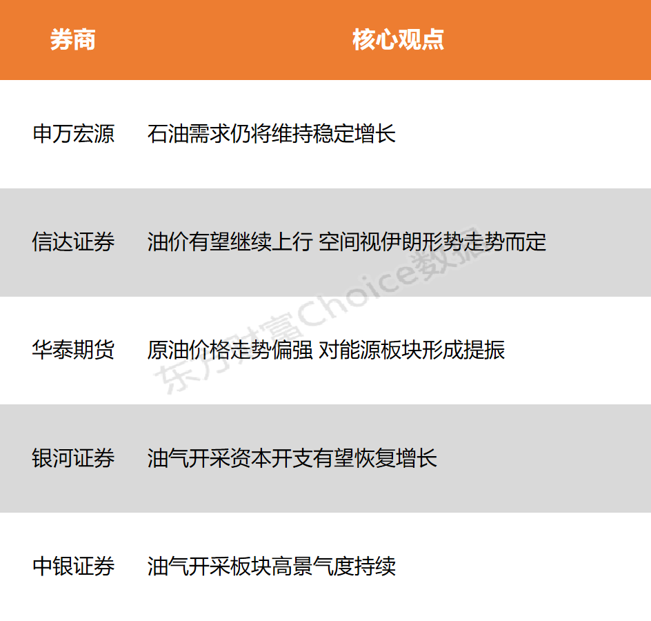 6月13日国际油价大幅飙升,WTI原油盘中突破77美元/桶,最高涨幅达到14.08%,本次上涨主要受地缘政治因素影响。申万宏源表示,预期石油需求仍将维持稳定增长,但增速有所放缓;信达证券指出,油价有望继续上行,空间视伊朗形势走势而定;银河证券认为,25年全球油气开采资本开支有望恢复增长。