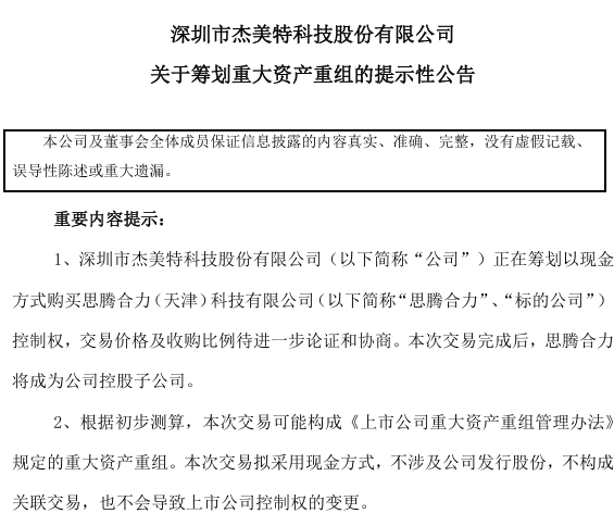 6月21日,杰美特(300868.SZ)公告称,公司正在筹划以现金方式购买思腾合力(天津)科技有限公司控制权,交易价格及具体股权收购比例待进一步论证和协商。根据初步测算,本次交易预计构成重大资产重组。