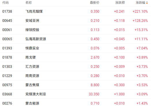 受益于反内卷政策,港股煤炭股延续涨势。截至发稿,飞尚无烟煤(01738.HK)、安域亚洲(00645.HK)、南戈壁(01878.HK)、蒙古焦煤(00975.HK)分别上涨221.10%、128.26%、3.89%、3.09%。